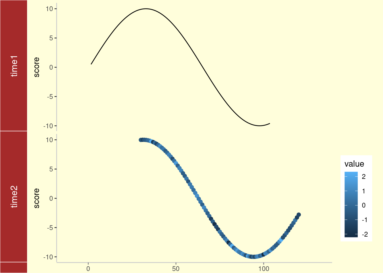 library(ggbio)df1 <-data.frame(time =1:100, score =sin((1:100)/20)*10)p1 <-qplot(data = df1, x = time, y = score, geom ="line")df2 <-data.frame(time =30:120, score =sin((30:120)/20)*10, value =rnorm(120-30+1))p2 <-ggplot(data = df2, aes(x = time, y = score)) +geom_line() +geom_point(size =2, aes(color = value))tracks(time1 = p1, time2 = p2) +xlim(1, 40) +theme_tracks_sunset()