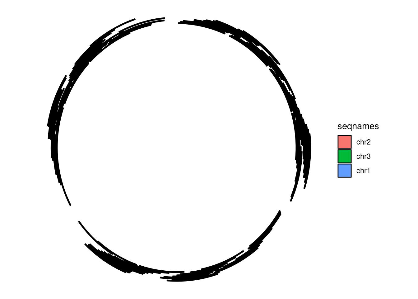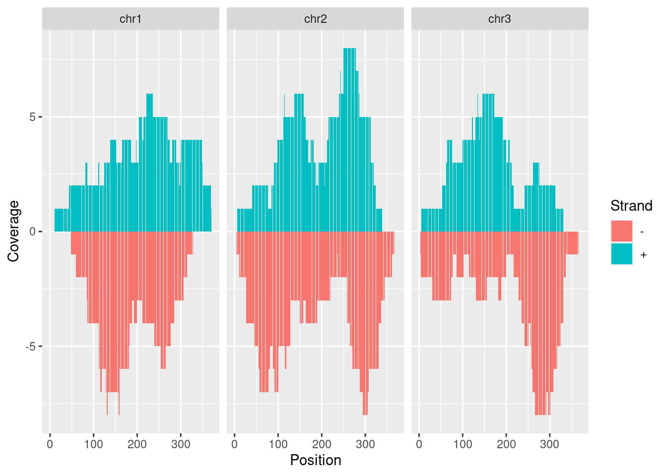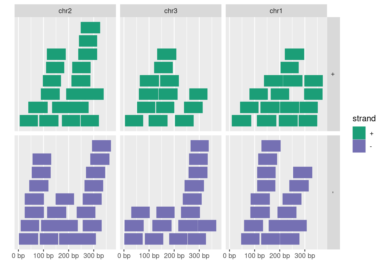 library(GenomicRanges)set.seed(1); N <-100; gr <-GRanges(seqnames =sample(c("chr1", "chr2", "chr3"), size = N, replace =TRUE), IRanges(start =sample(1:300, size = N, replace =TRUE), width =sample(70:75, size = N,replace =TRUE)), strand =sample(c("+", "-"), size = N, replace =TRUE), value =rnorm(N, 10, 3), score =rnorm(N, 100, 30), sample =sample(c("Normal", "Tumor"), size = N, replace =TRUE), pair =sample(letters, size = N, replace =TRUE))autoplot(gr, aes(color = strand, fill = strand), facets = strand ~ seqnames)