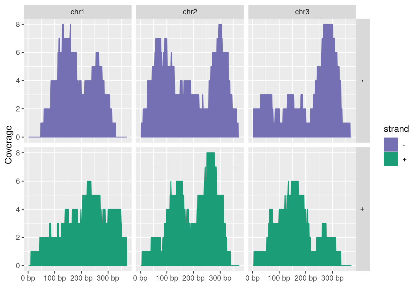autoplot(gr, aes(color = strand, fill = strand), facets = strand ~ seqnames, stat ="coverage")