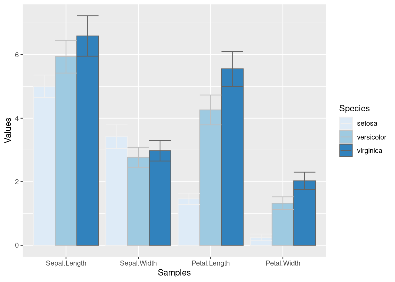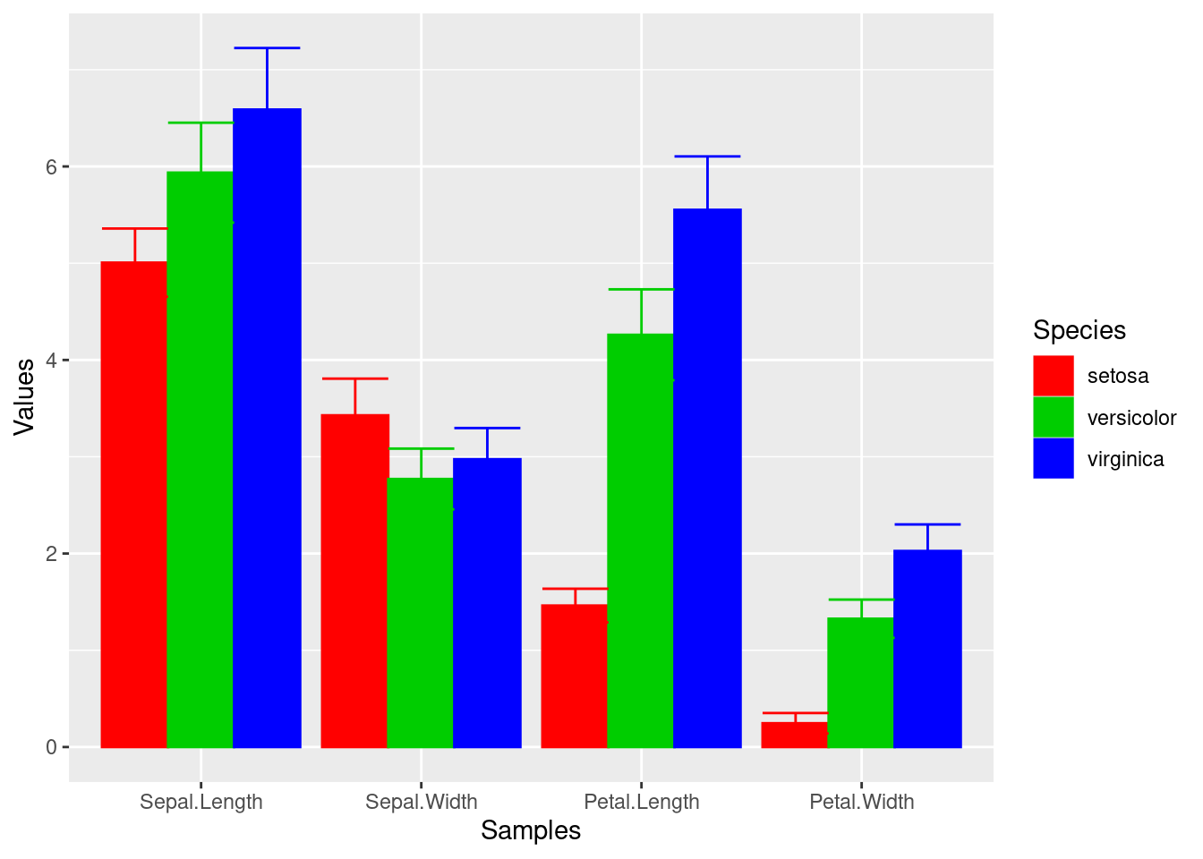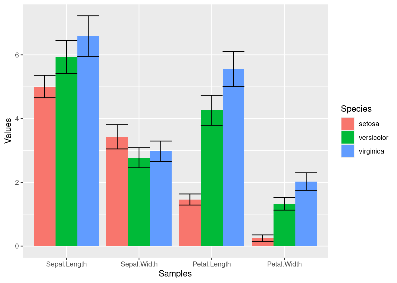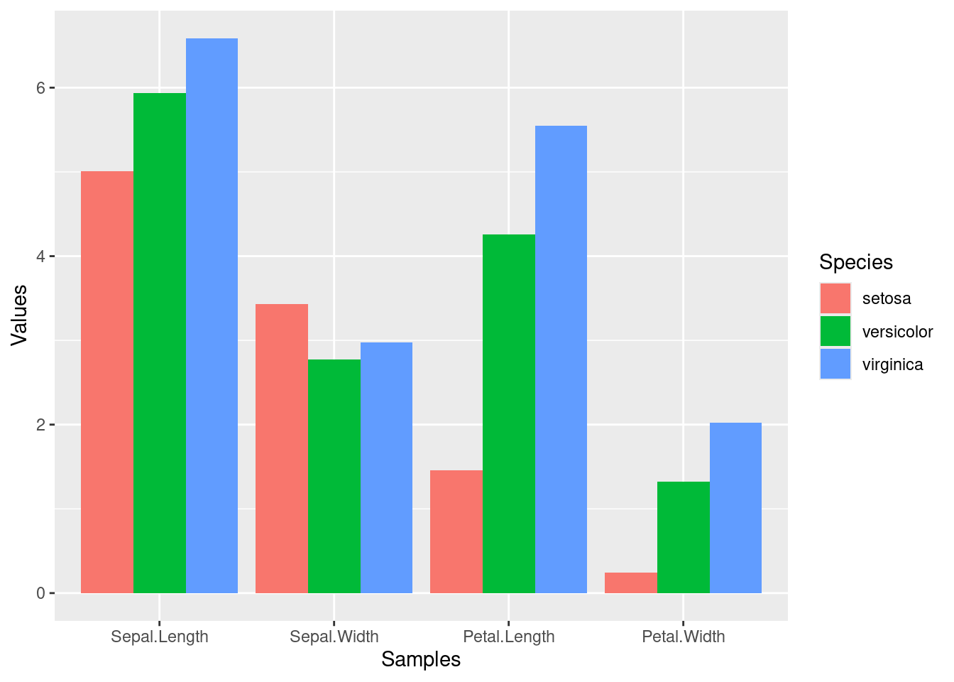 p <-ggplot(df_mean, aes(Samples, Values, fill = Species)) +geom_bar(position="dodge", stat="identity")print(p)