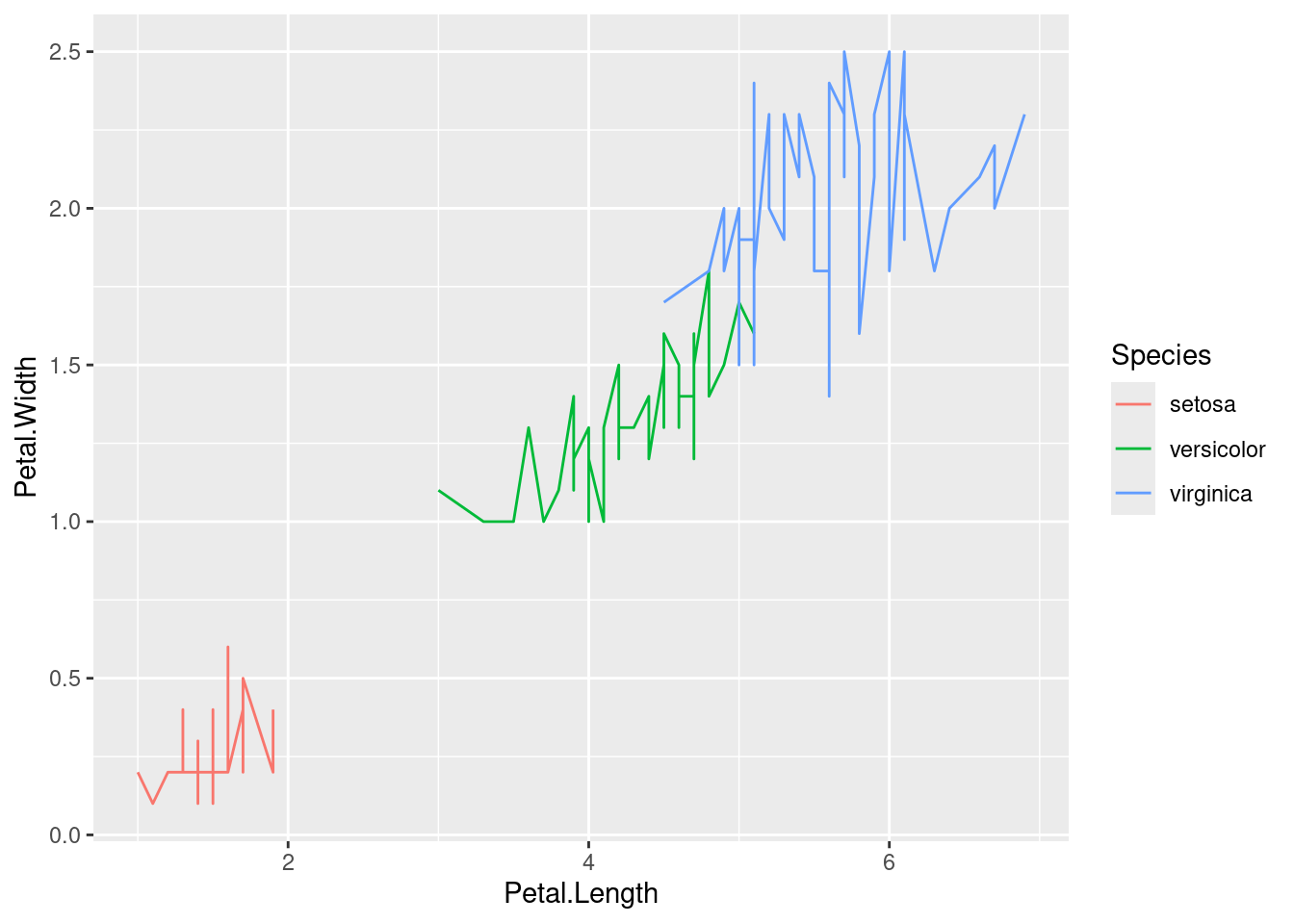 p <-ggplot(iris, aes(Petal.Length, Petal.Width, group=Species, color=Species)) +geom_line() print(p)
