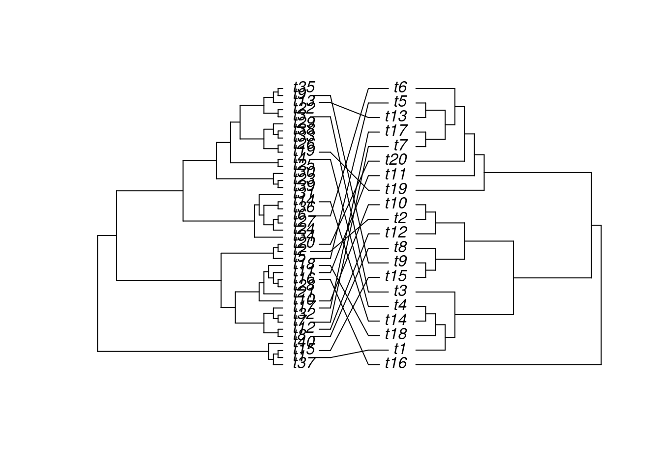 library(ape)tree1 <-rtree(40)tree2 <-rtree(20)association <-cbind(tree2$tip.label, tree2$tip.label)cophyloplot(tree1, tree2, assoc = association,length.line =4, space =28, gap =3)